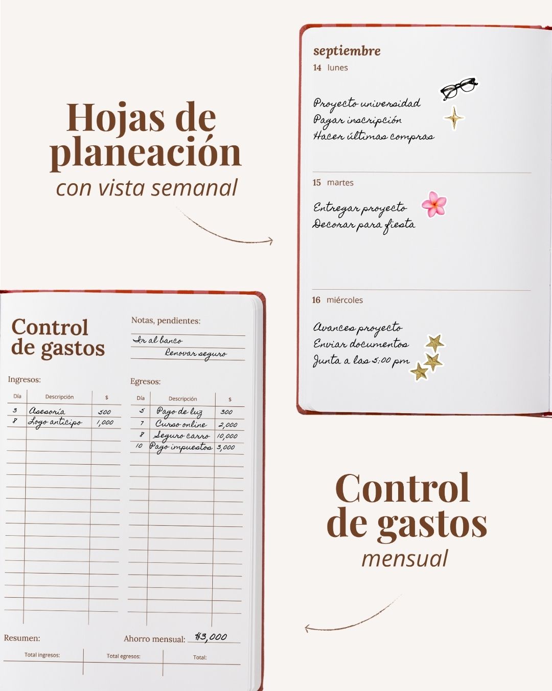 Tamaño 15x21 cm, pasta dura, cosida, acabado soft touch, incluye listón separador. Compacta, cómoda, ideal para llevarla a todos lados.