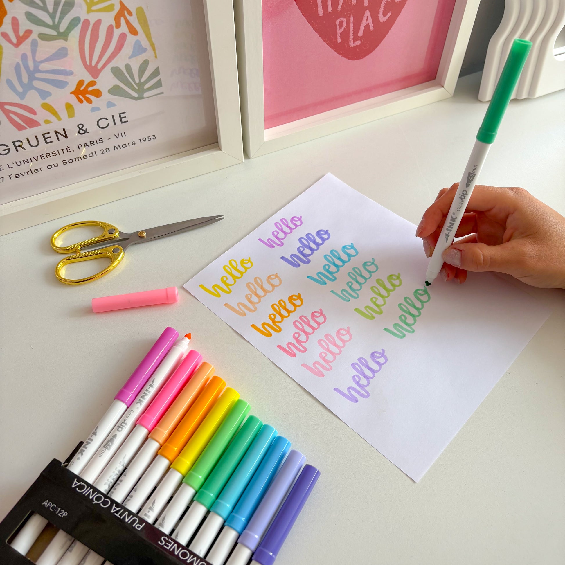 Plumones punta conica de 4.5mm, 12 tonos pastel ¡Para realizar lettering y otros tipos de trazos! Son ideales si eres principiante en letternig, ya que su calidad es bastante buena.
