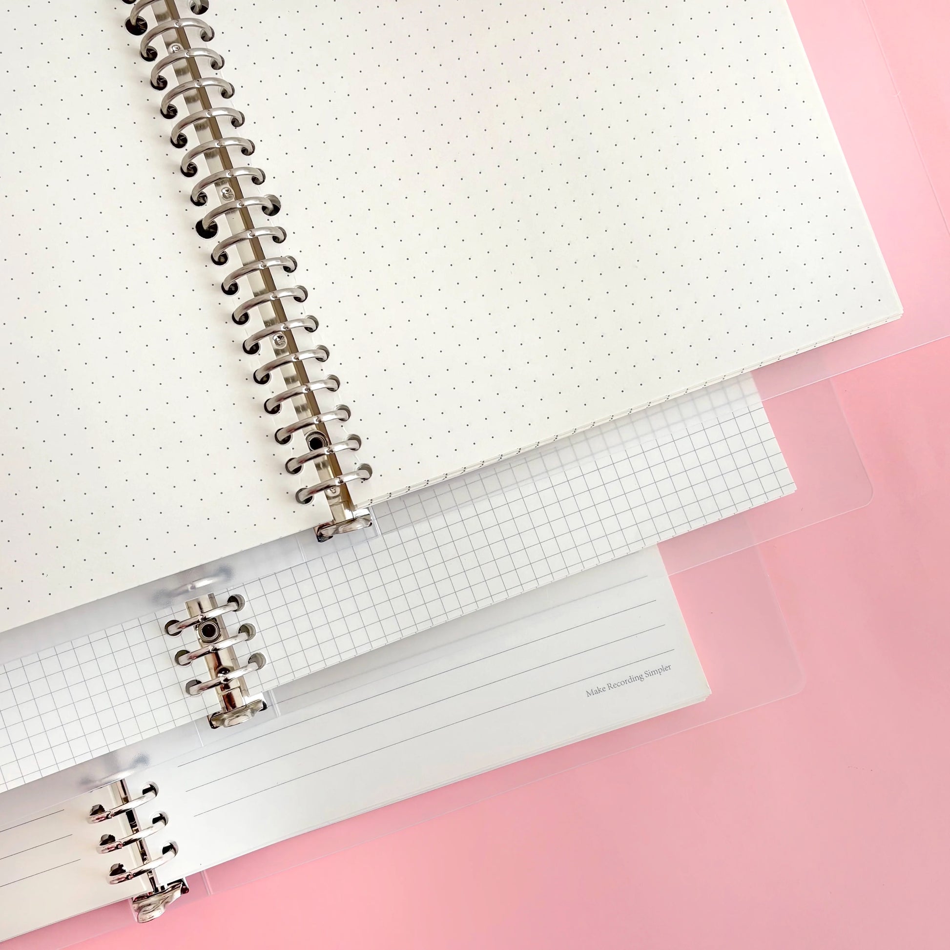 Carpeta/libreta “infinita” incluye 50 hojas, con aros metálicos para abrir y agregar más repuestos si lo deseas. Su portada es transparente para personalizarla a tu estilo.
