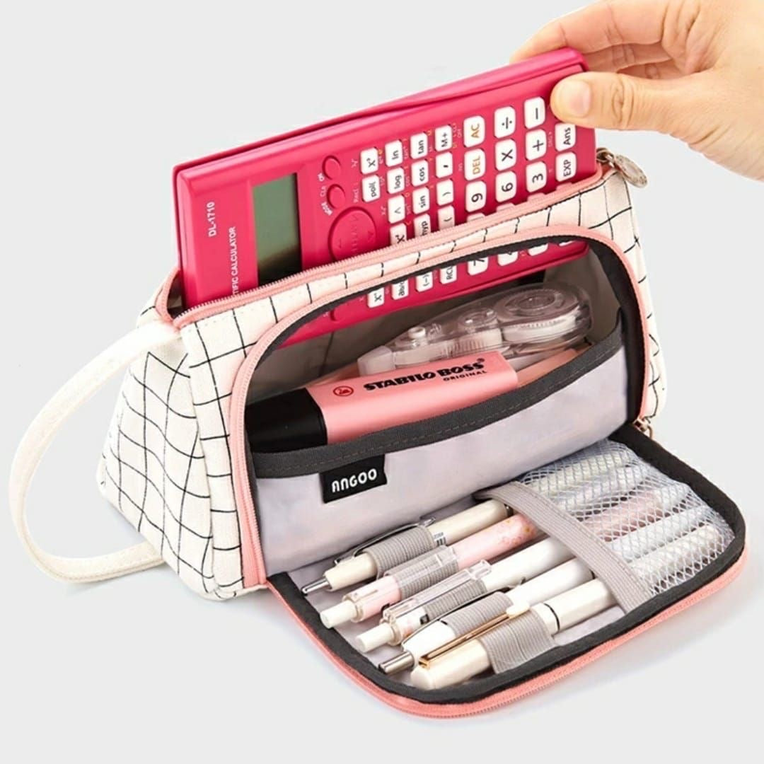 Organízate con un estuche de tela estilo rectangular con capacidad para más de 50 plumas, lapiceros, resaltadores, plumones y complementos de papelería.