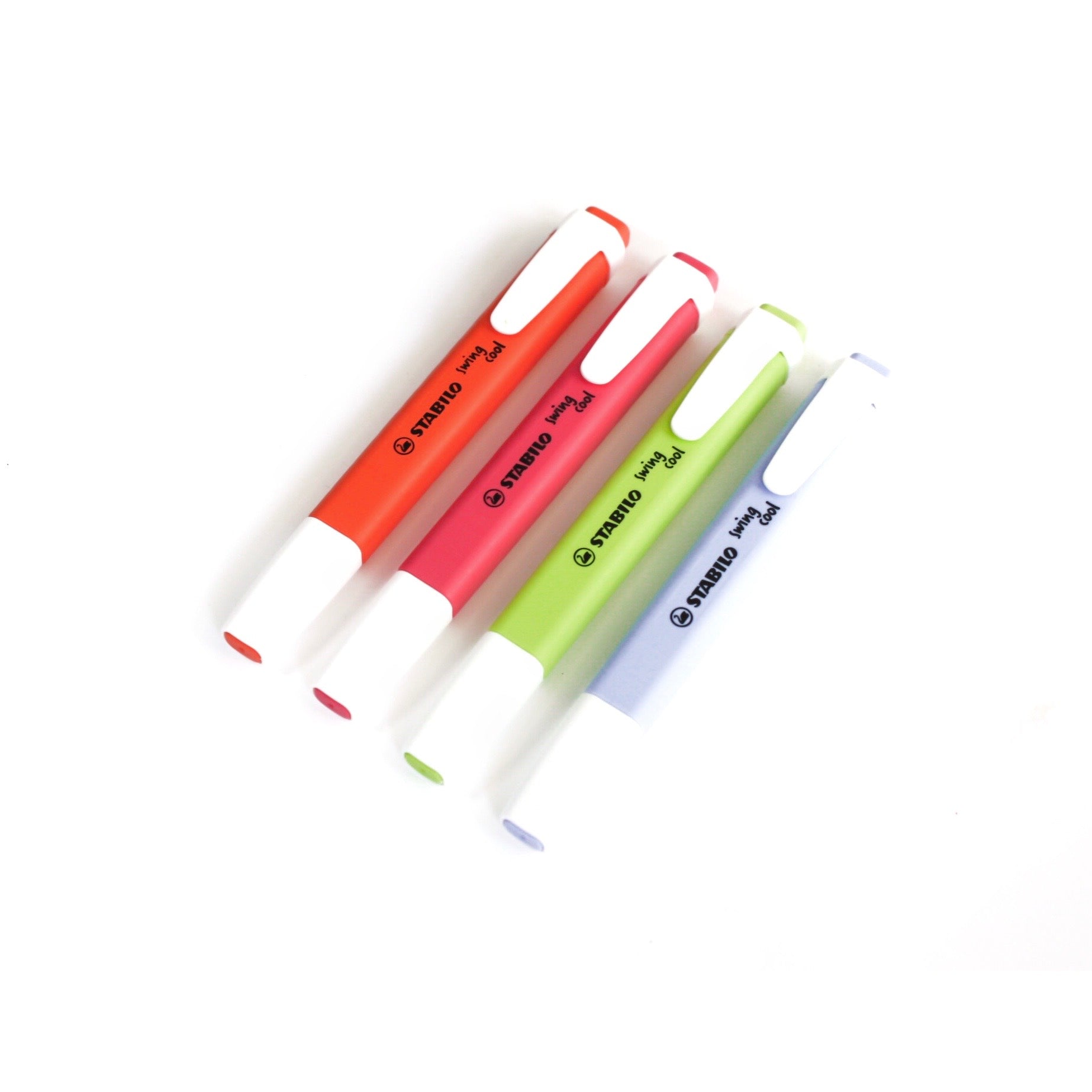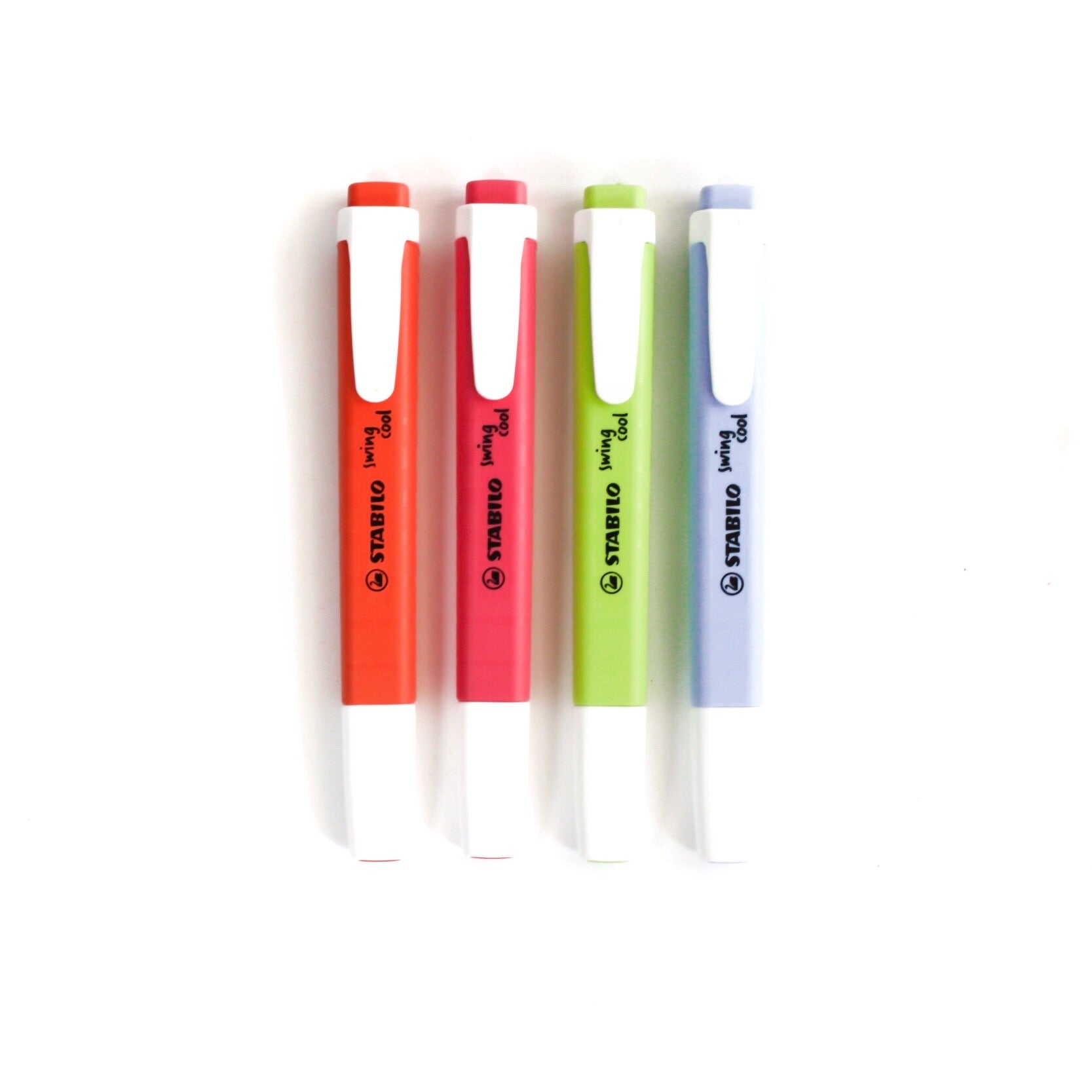 4 marcatextos swing cool, en tonos pastel que cuentan con tecnología antisecado: pueden permanecer destapados hasta por 4 horas.