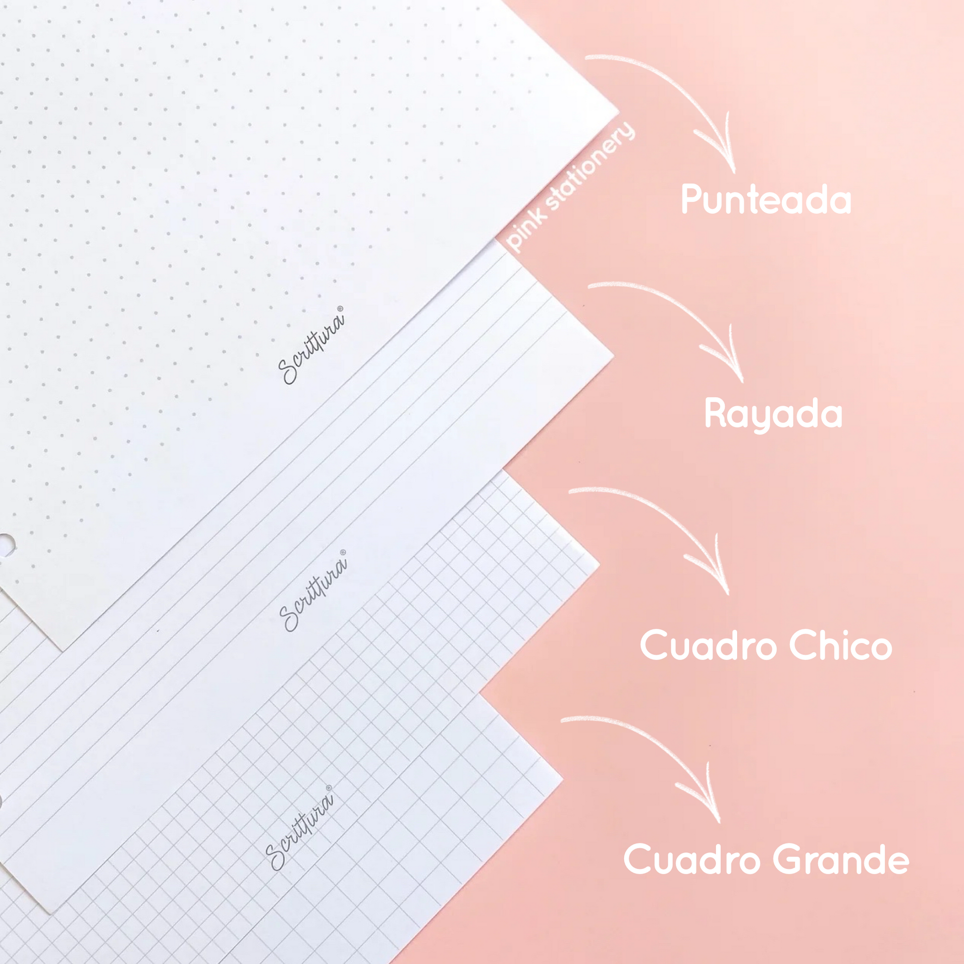 El paquete incluye un ciento de hojas de 105 gr (hojas muy gruesas), tamaño carta, perfectas para que no se traspasen los plumones, plumas, estilógrafos.